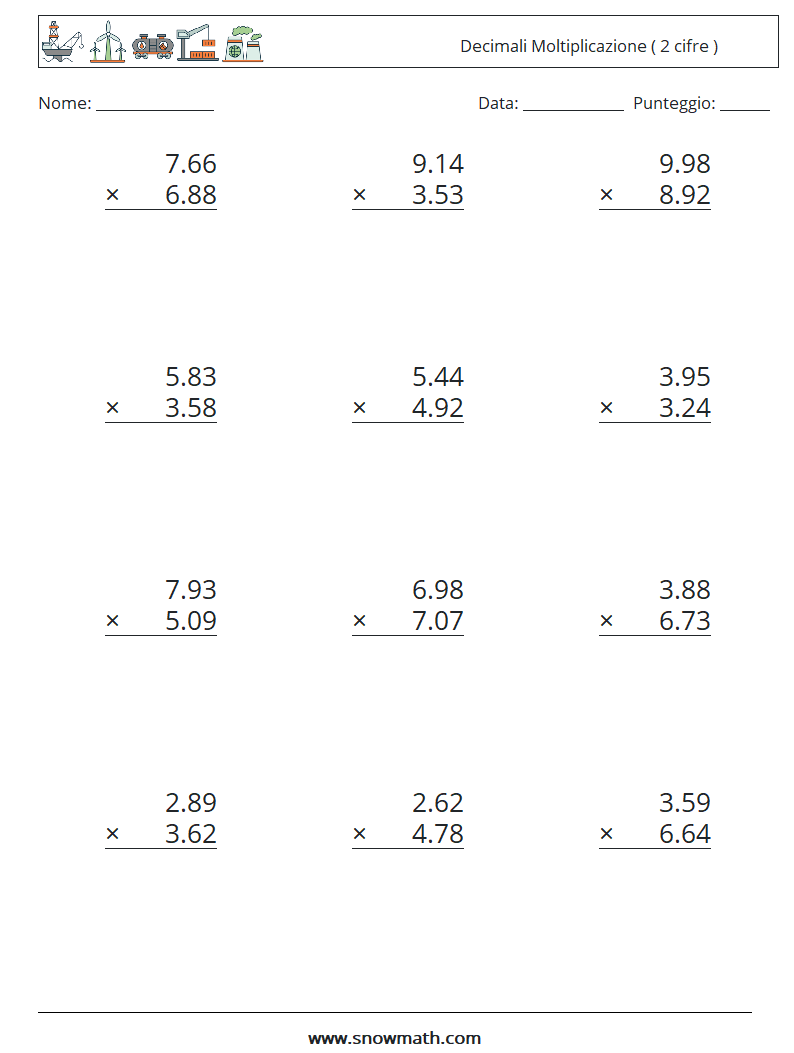 (12) Decimali Moltiplicazione ( 2 cifre ) Fogli di lavoro di matematica 12