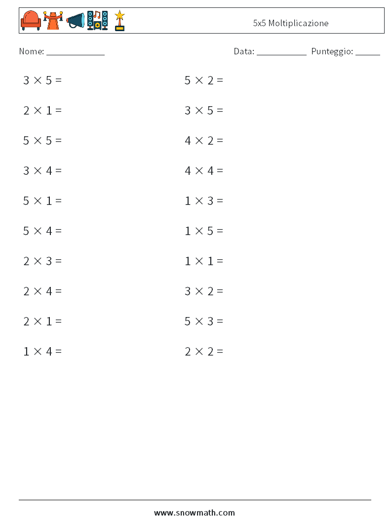 (20) 5x5 Moltiplicazione Fogli di lavoro di matematica 1