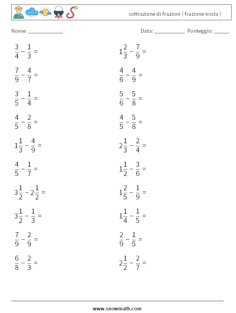 (20) sottrazione di frazioni ( frazione mista ) Fogli di lavoro di matematica 12