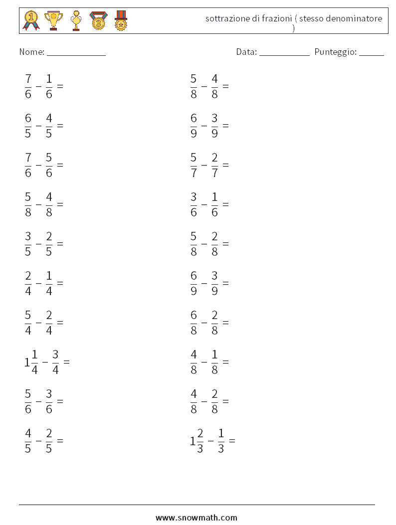 (20) sottrazione di frazioni ( stesso denominatore ) Fogli di lavoro di matematica 6