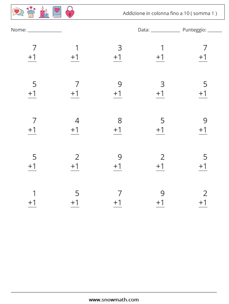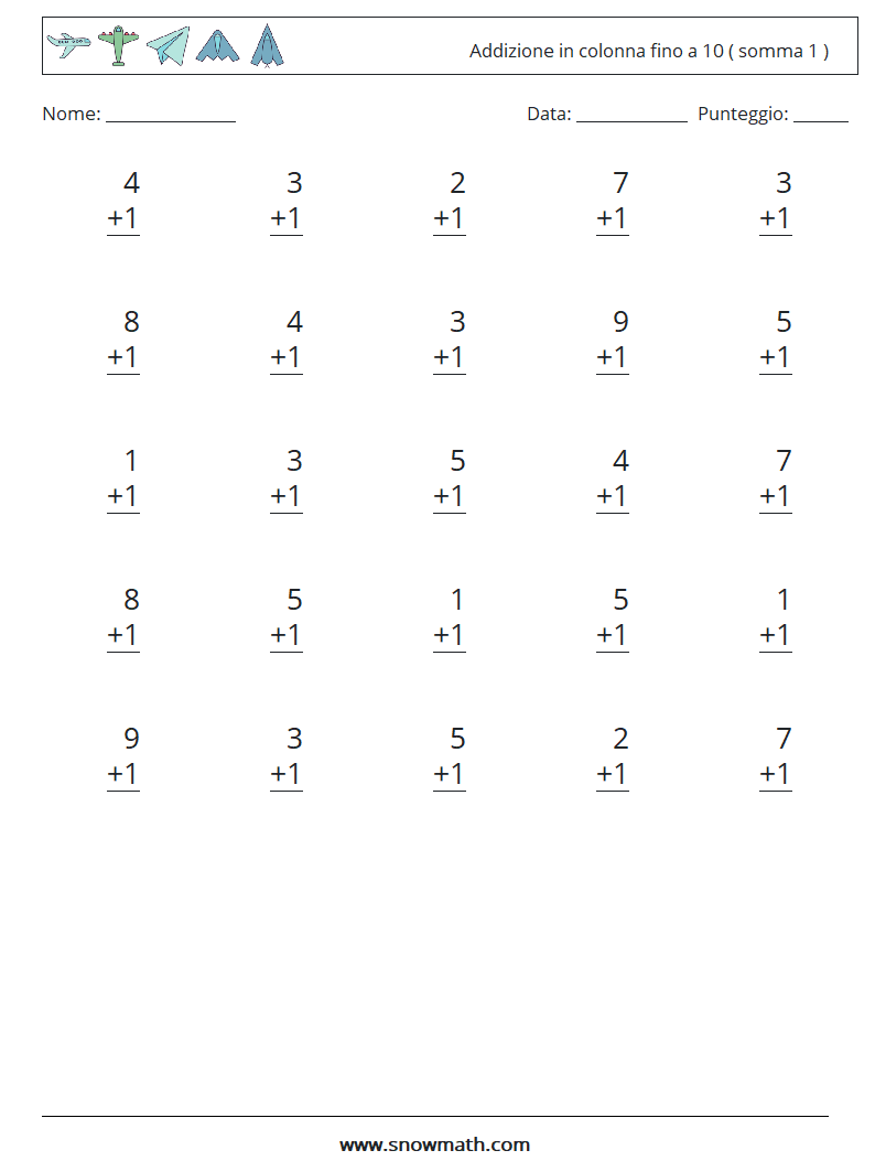 (25) Addizione in colonna fino a 10 ( somma 1 ) Fogli di lavoro di matematica 5