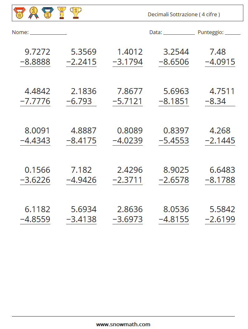 (25) Decimali Sottrazione ( 4 cifre ) Fogli di lavoro di matematica 12