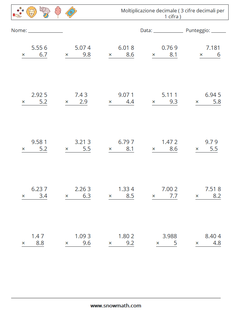(25) Moltiplicazione decimale ( 3 cifre decimali per 1 cifra ) Fogli di lavoro di matematica 5