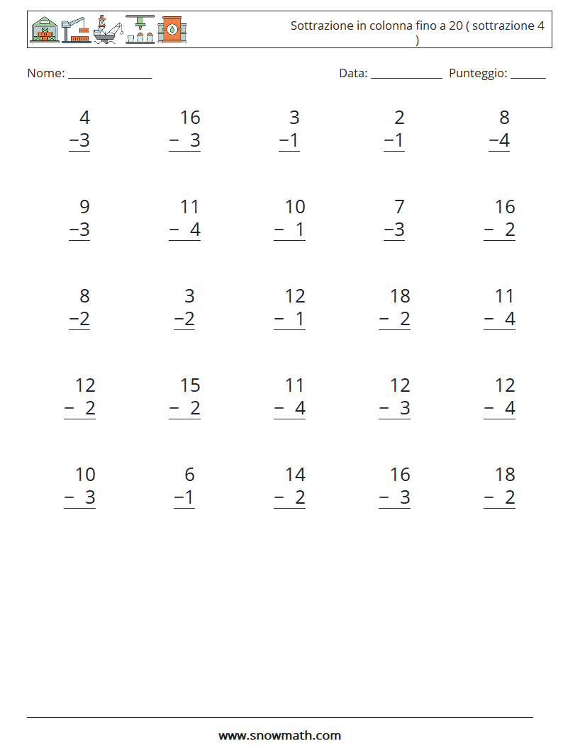 (25) Sottrazione in colonna fino a 20 ( sottrazione 4 ) Fogli di lavoro di matematica 12