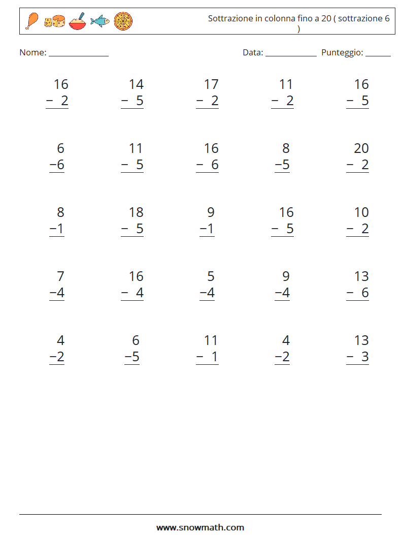 (25) Sottrazione in colonna fino a 20 ( sottrazione 6 ) Fogli di lavoro di matematica 6
