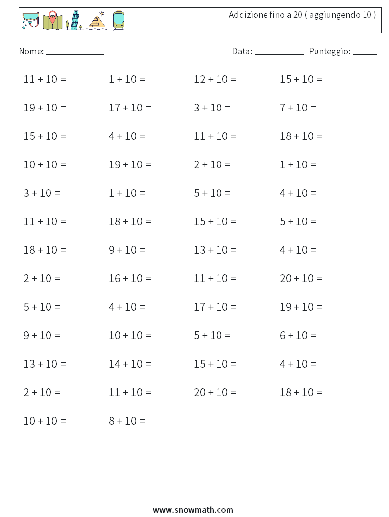 (50 domande di matematica) Addizione entro 20, scarica fogli di lavoro di matematica, aggiungendo 10