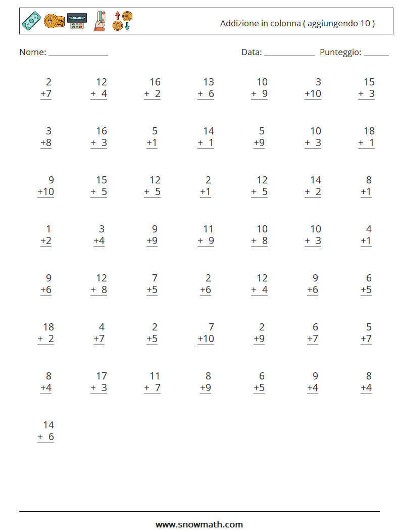 (50) Addizione in colonna ( aggiungendo 10 ) Fogli di lavoro di matematica 9