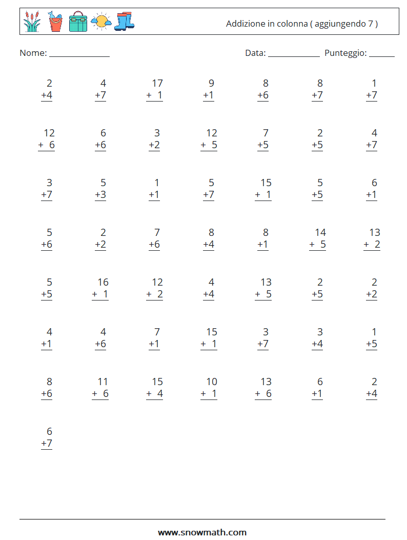 (50) Addizione in colonna ( aggiungendo 7 ) Fogli di lavoro di matematica 6
