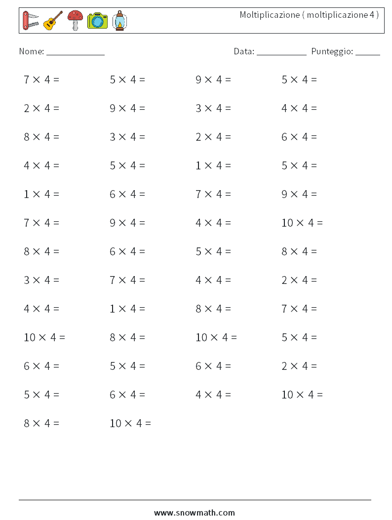 (50 domande di matematica) Stampa fogli di lavoro di moltiplicazione (moltiplicazione per 4)