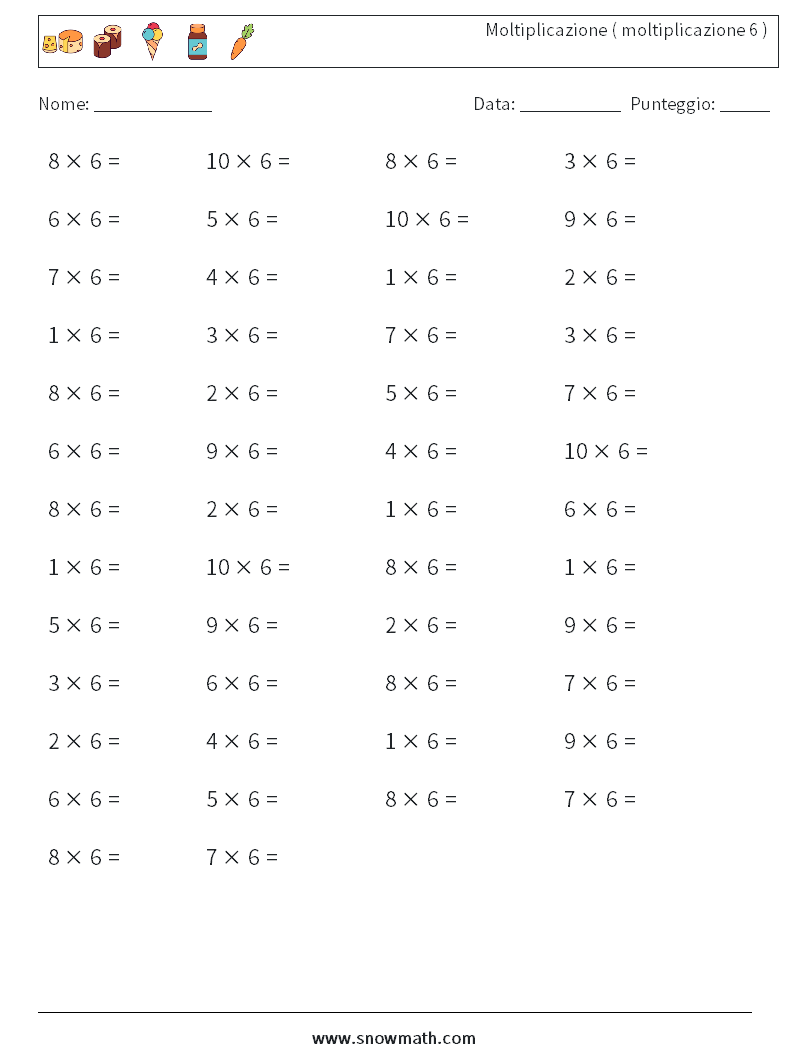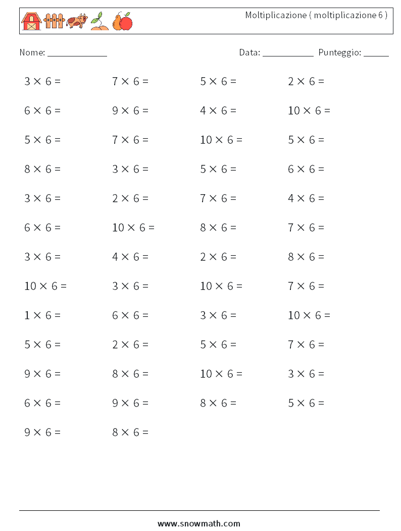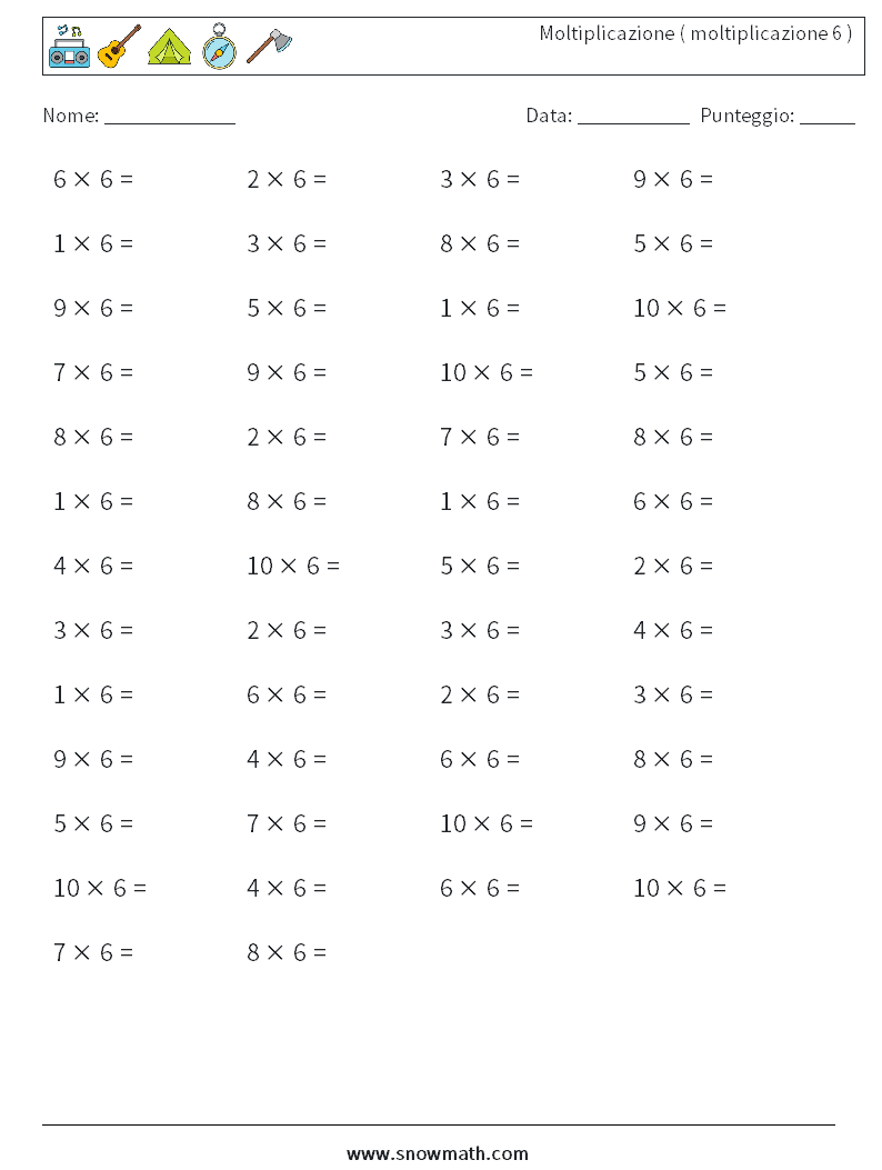 (50 domande di matematica) Stampa fogli di lavoro di moltiplicazione (moltiplicazione per 6)