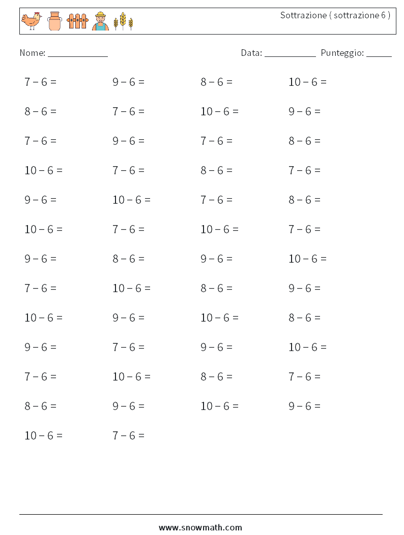 (50) Sottrazione ( sottrazione 6 ) Fogli di lavoro di matematica 1