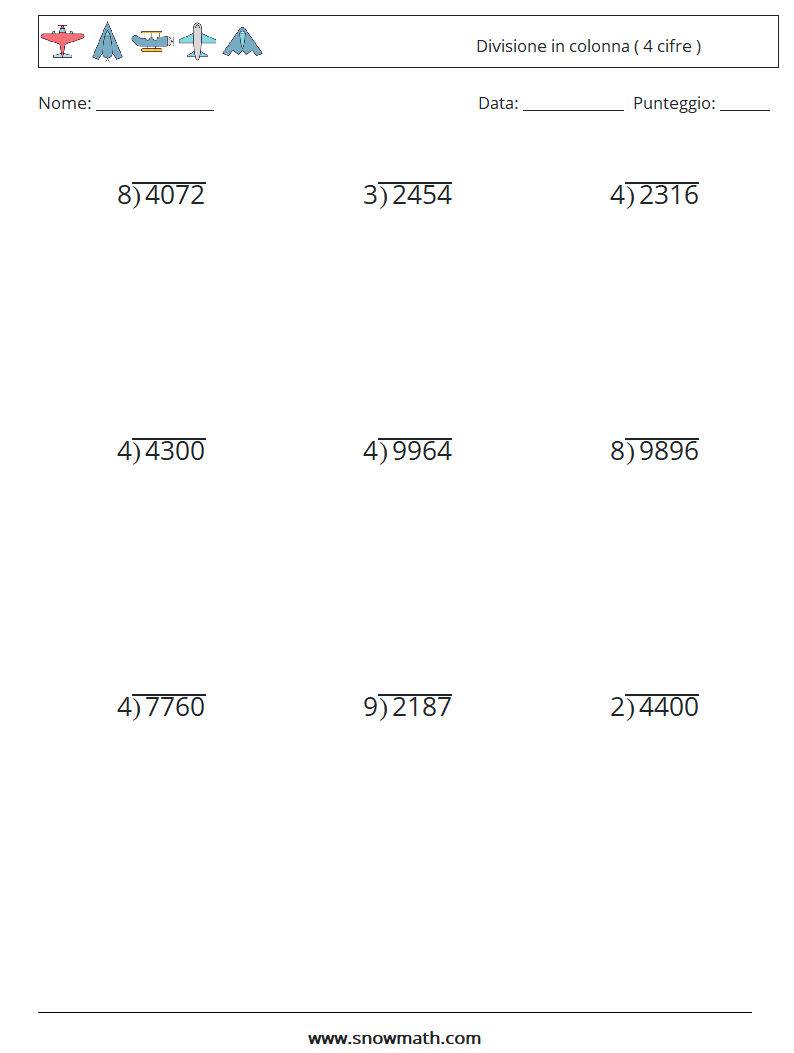 (9) Divisione in colonna ( 4 cifre ) Fogli di lavoro di matematica 3