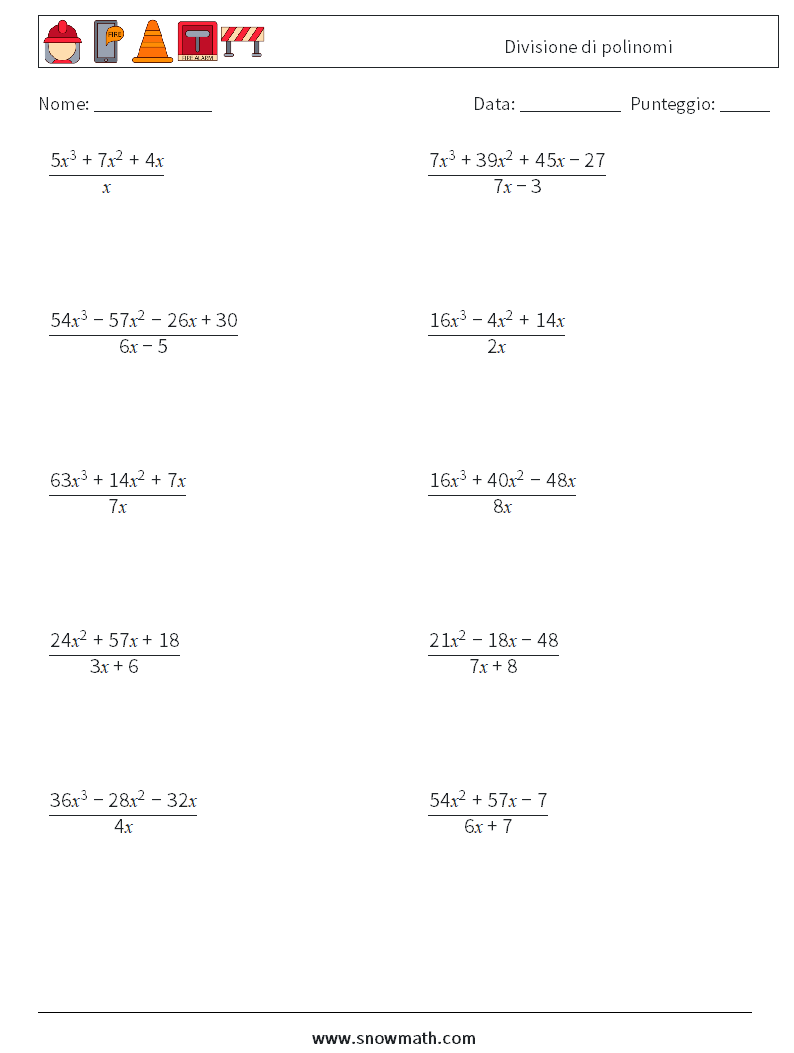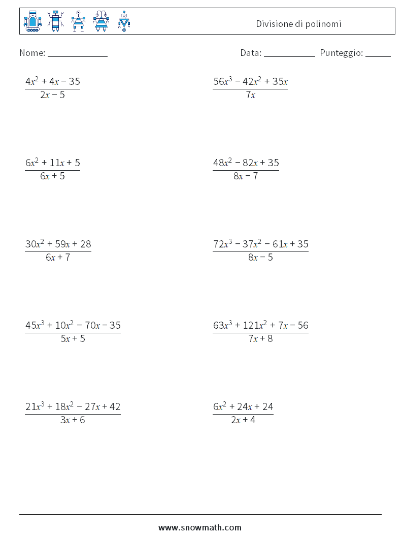 Divisione di polinomi Fogli di lavoro di matematica 9