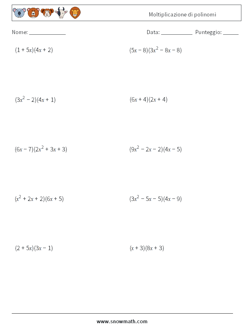 Moltiplicazione di polinomi Fogli di lavoro di matematica 6