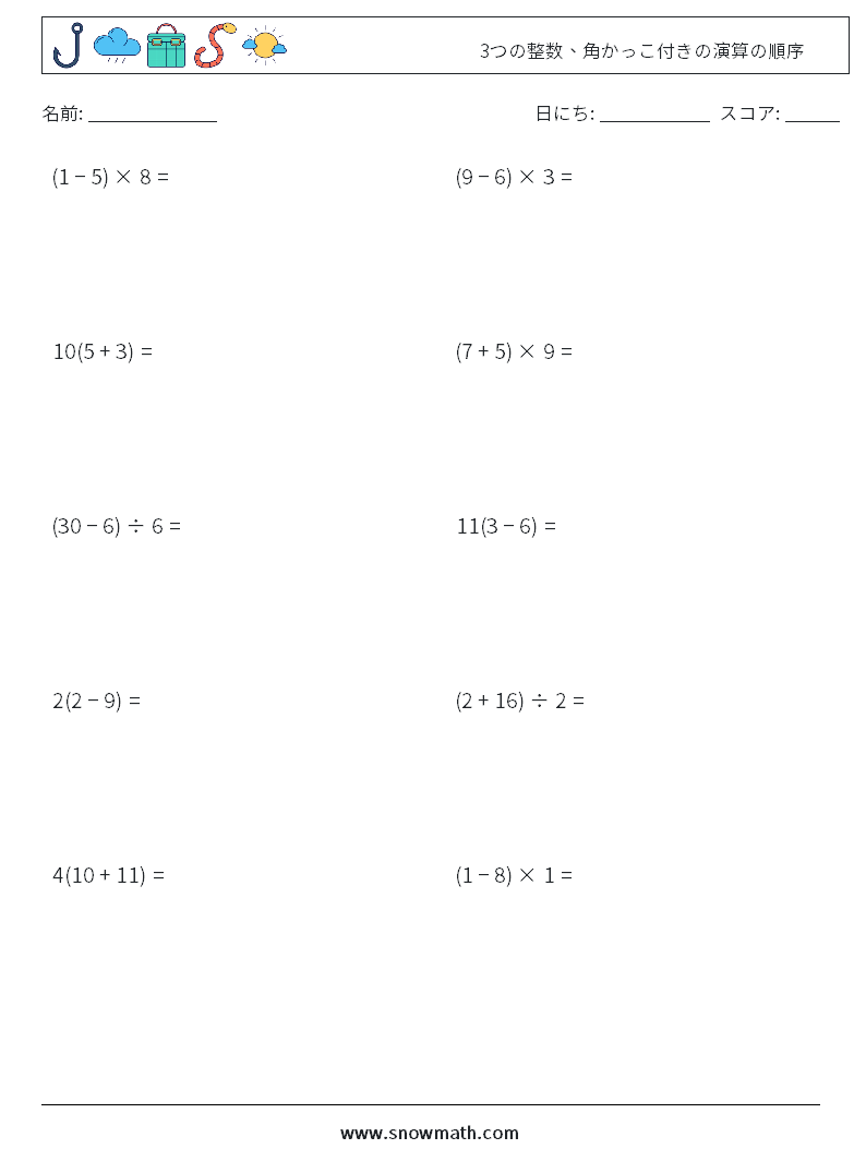 (10) 3つの整数、角かっこ付きの演算の順序 数学ワークシート 3