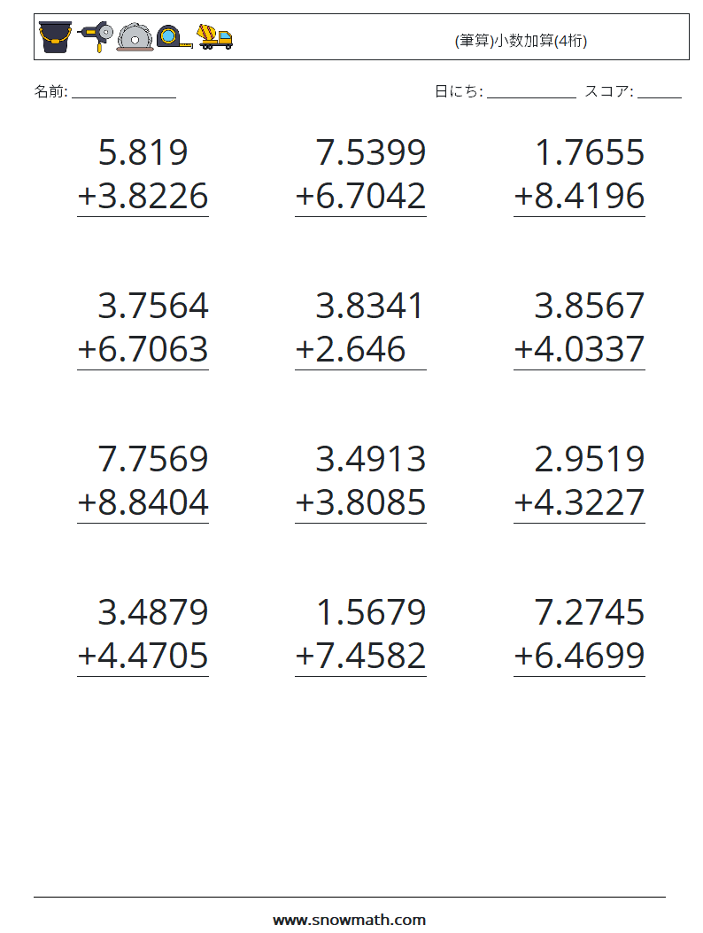 (12) (筆算)小数加算(4桁) 数学ワークシート 4