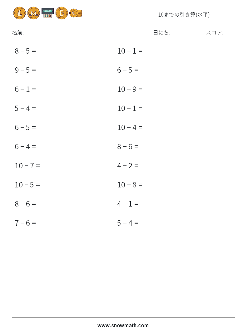 (20) 10までの引き算(水平) 数学ワークシート 1