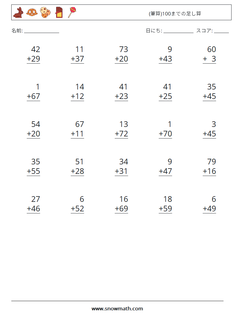 (筆算)(25の数学の質問)学生は100までの足し算をする方法を学びます