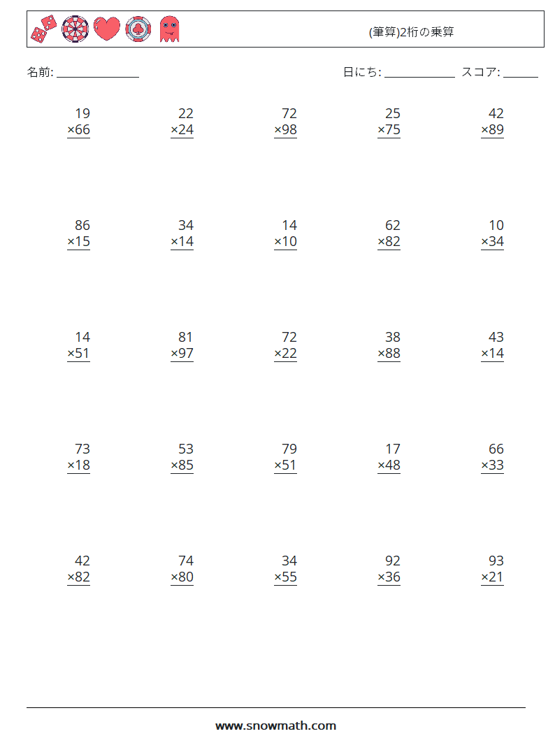 (筆算)(25の数学の質問)2桁の掛け算のワークシートを練習します。