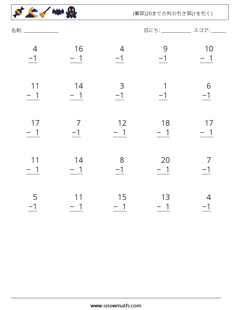 (25) (筆算)20までの列の引き算(1を引く) 数学ワークシート 12