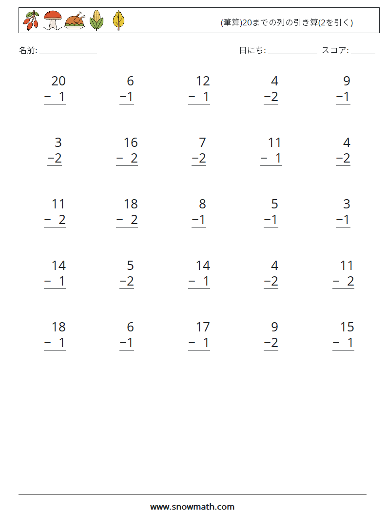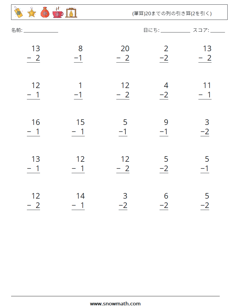 (25) (筆算)20までの列の引き算(2を引く) 数学ワークシート 12