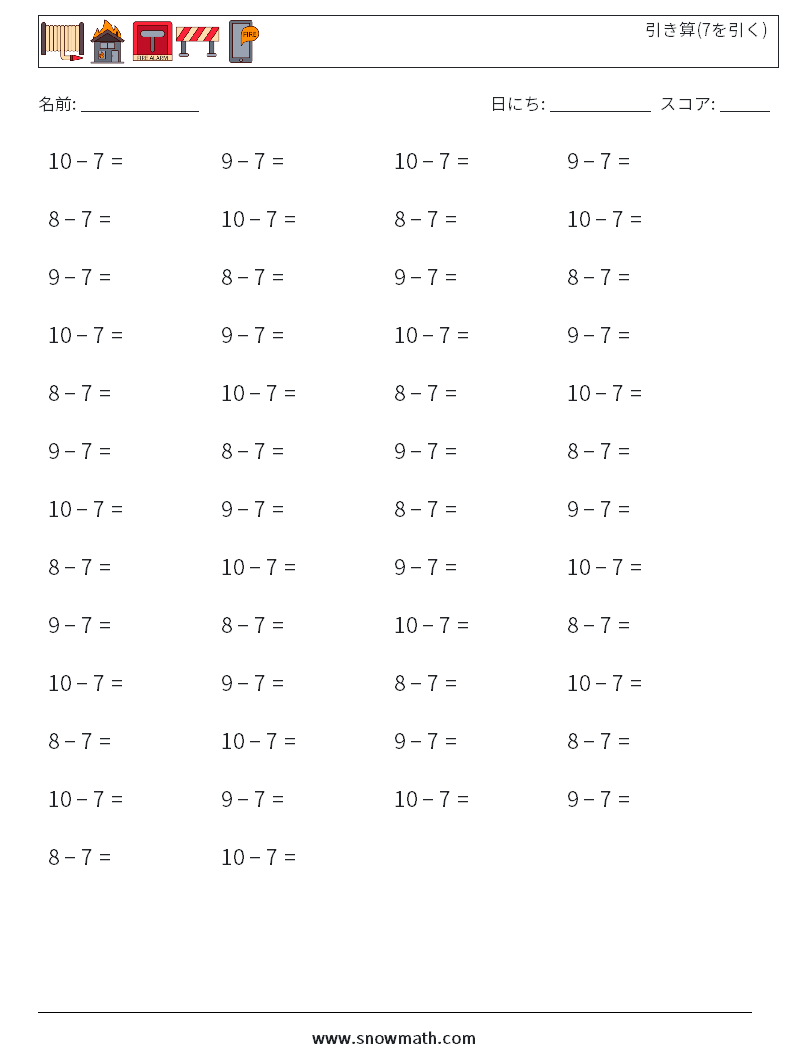 (50の数学の質問)引き算、引き算、7、数学のワークシートを練習します。