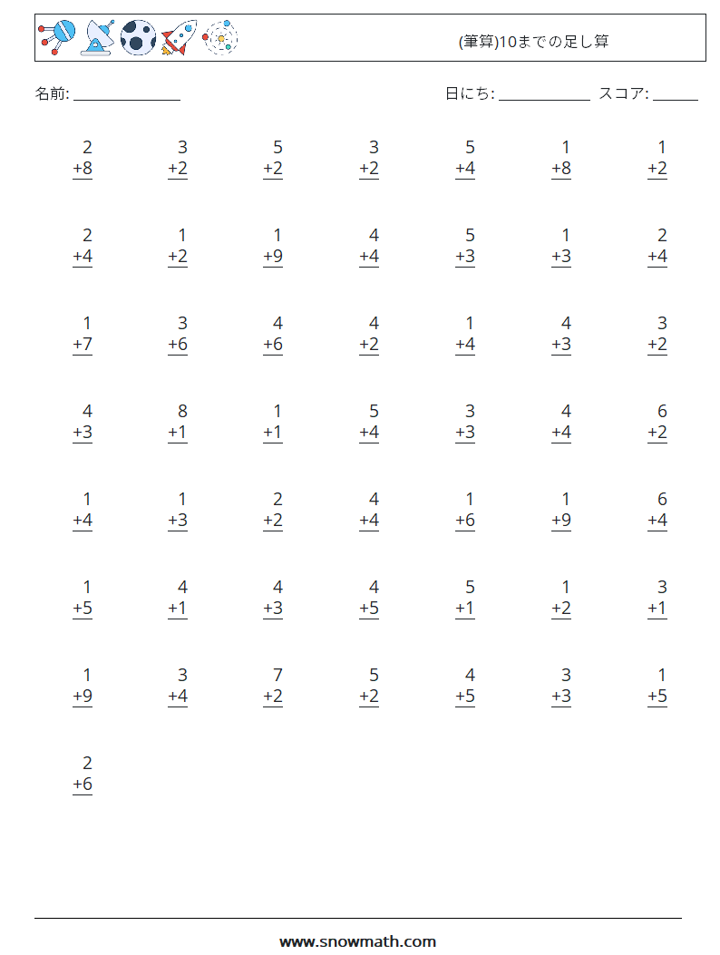 (50) (筆算)10までの足し算 数学ワークシート 3