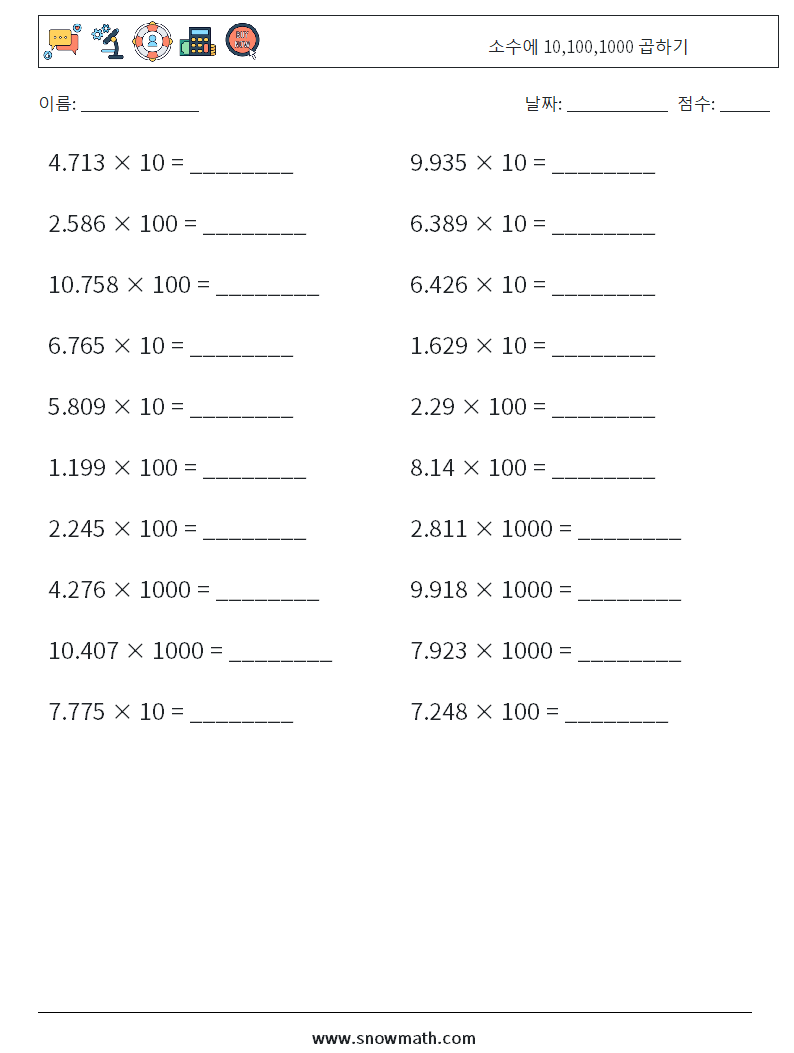 소수에 10,100,1000 곱하기 수학 워크시트 3
