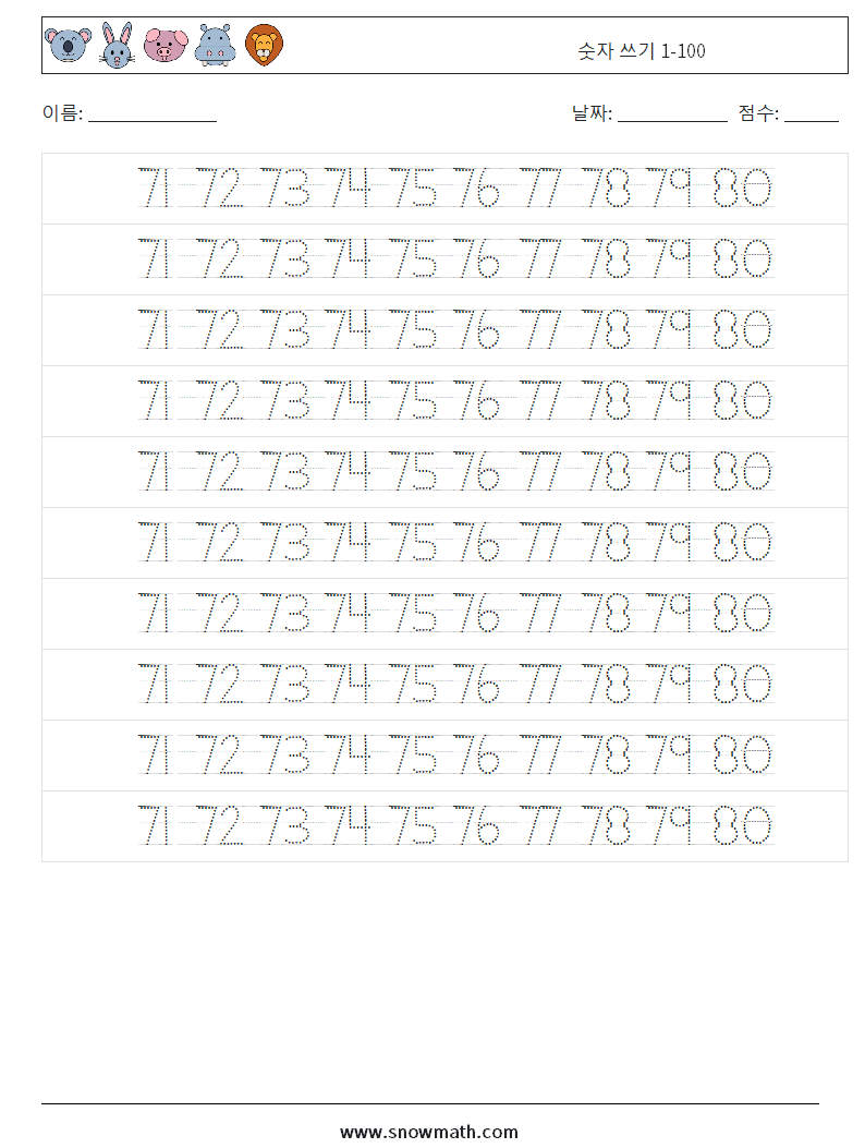 숫자 쓰기 1-100 수학 워크시트 32