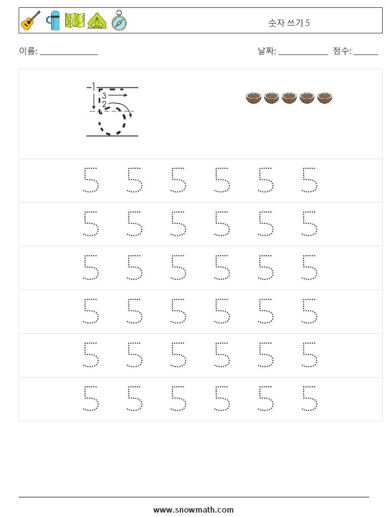 숫자 쓰기 5 수학 워크시트 5