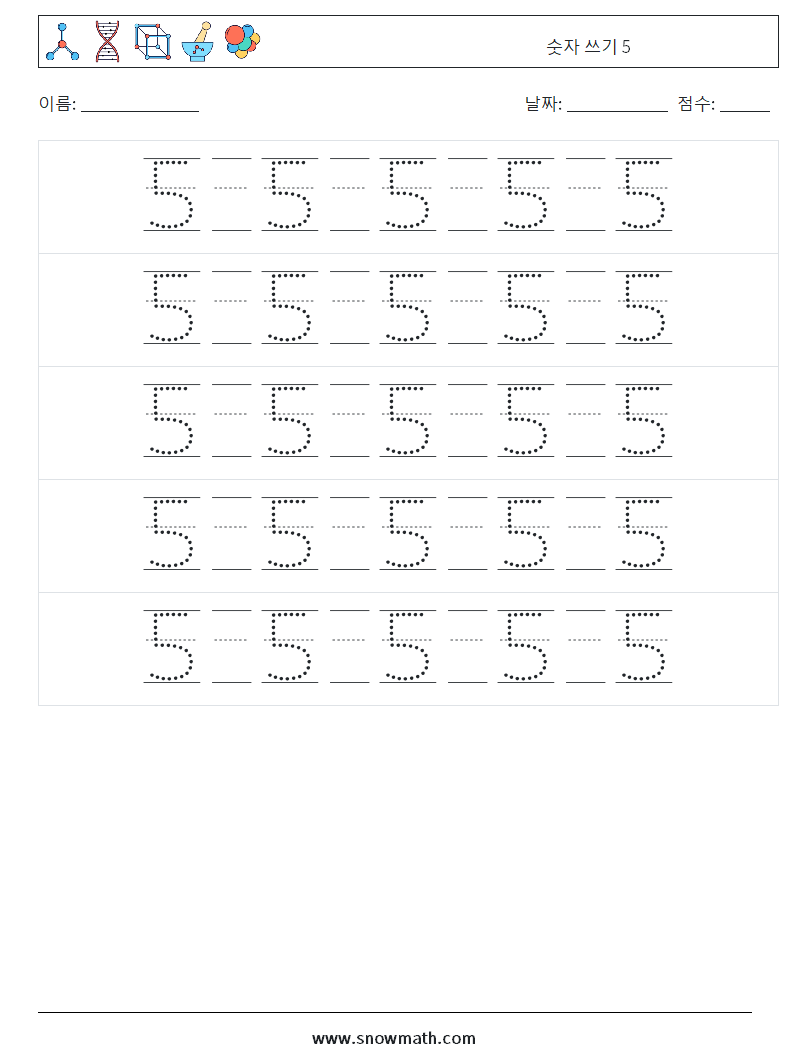 숫자 쓰기 5 수학 워크시트 22
