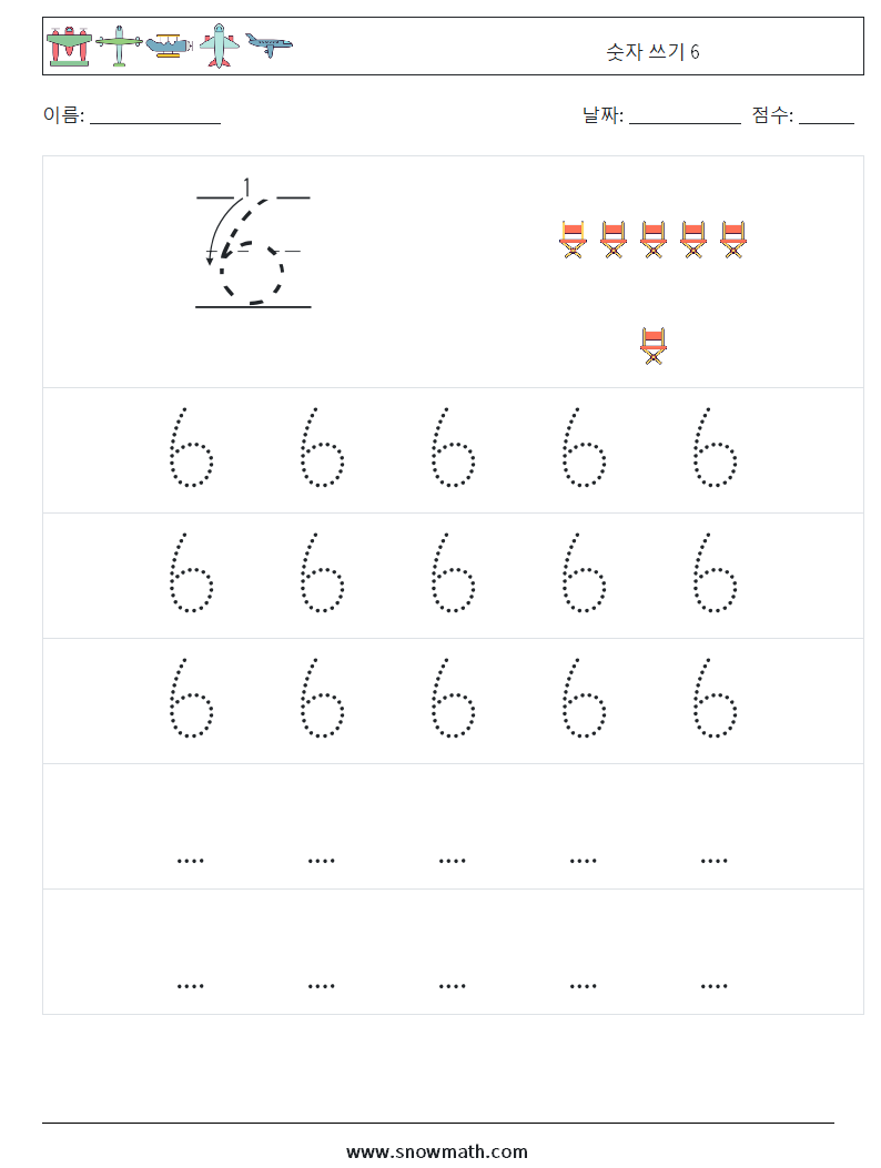 숫자 6, 인쇄 가능한 수학 워크시트 작성 방법 배우기