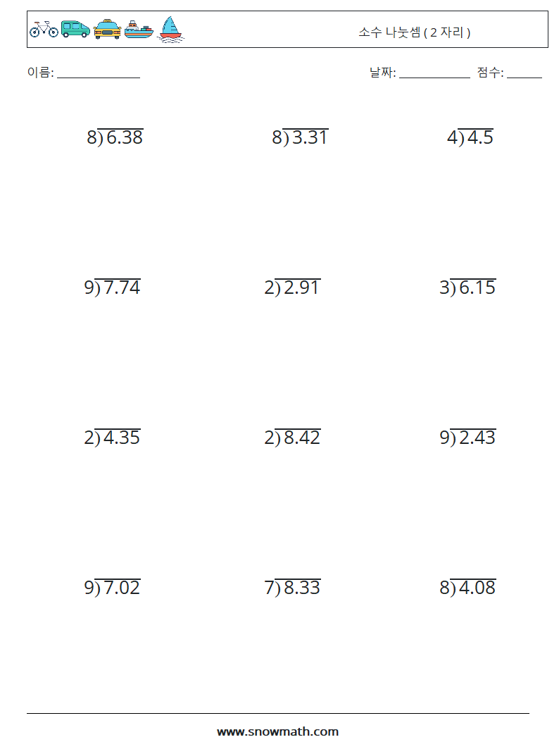 (12) 소수 나눗셈 ( 2 자리 ) 수학 워크시트 12