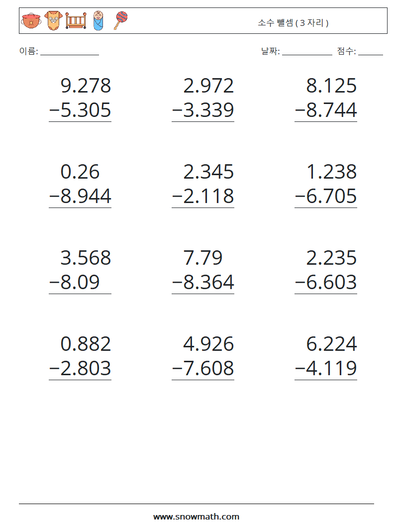 (12) 소수 뺄셈 ( 3 자리 ) 수학 워크시트 8