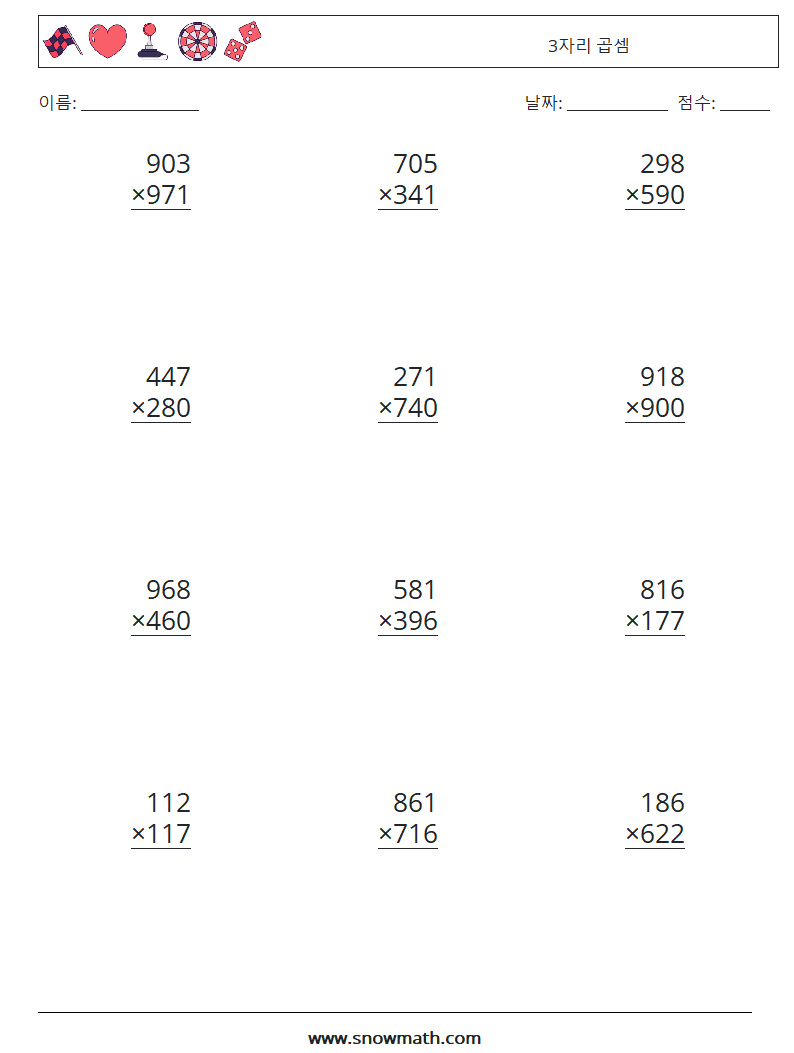(12 수학 문제) 3자리 곱셈 워크시트를 연습합니다.