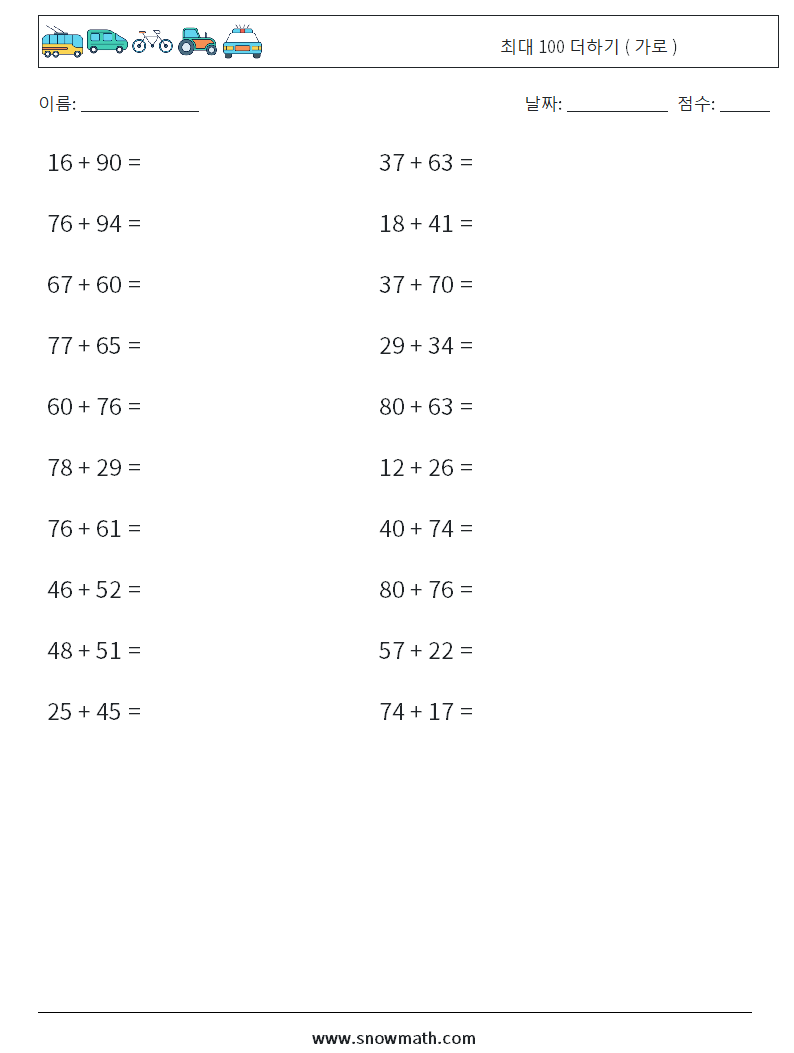 (20) 최대 100 더하기 ( 가로 ) 수학 워크시트 1