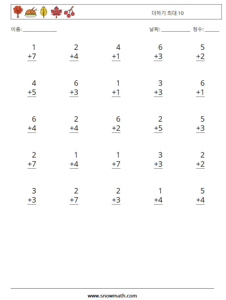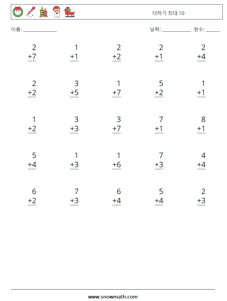 ( 수학 문제 25 개 ) 덧셈 을 최대 10 개까지 연습