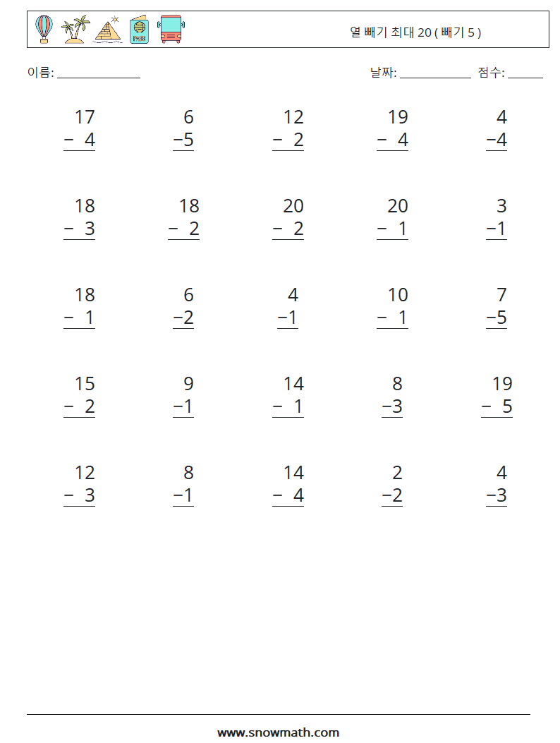 (25) 열 빼기 최대 20 ( 빼기 5 ) 수학 워크시트 6