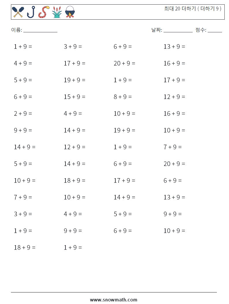 (50) 최대 20 더하기 ( 더하기 9 ) 수학 워크시트 5