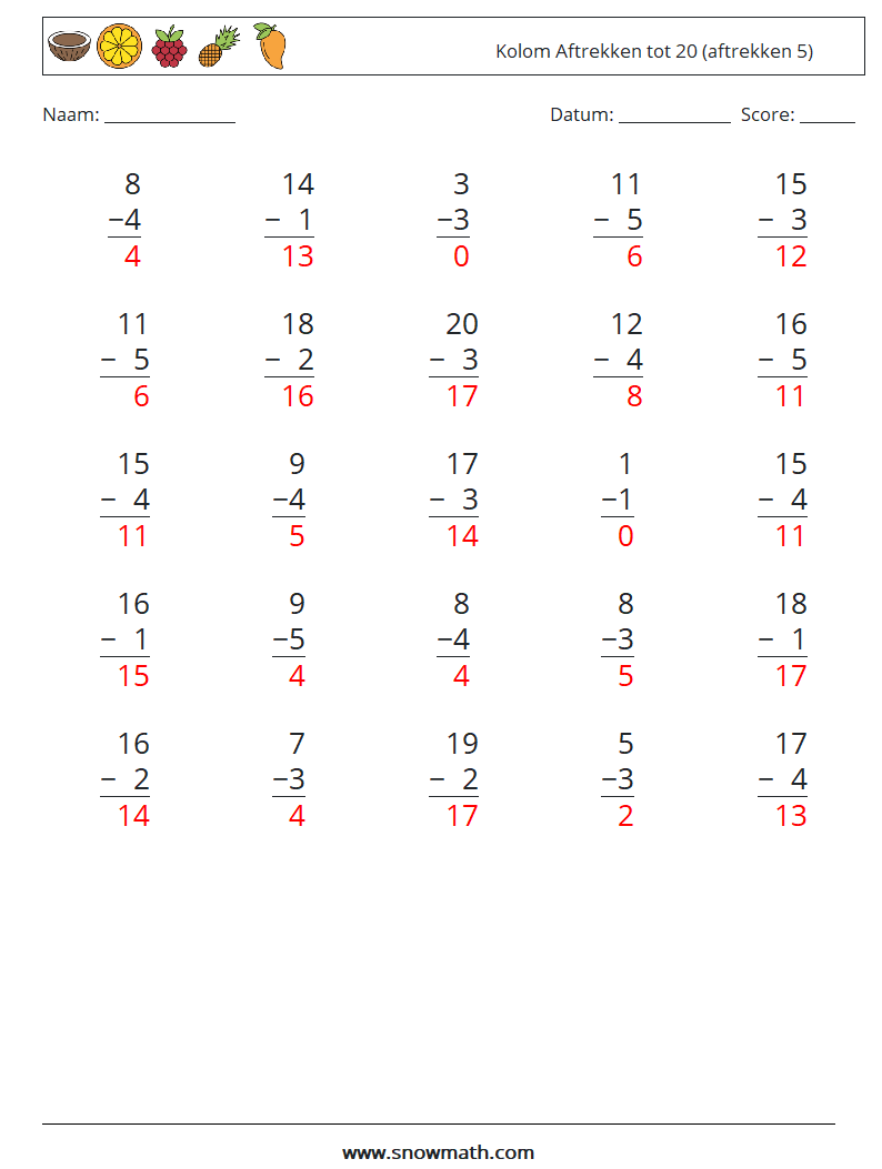 (25) Kolom Aftrekken tot 20 (aftrekken 5)