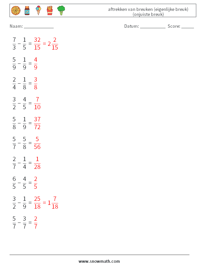 (10) aftrekken van breuken (eigenlijke breuk) (onjuiste breuk)