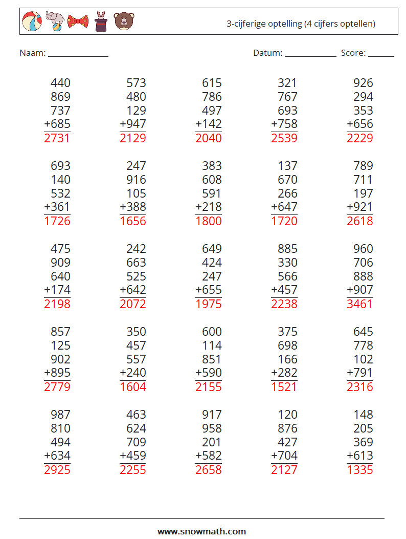 (25) 3-cijferige optelling (4 cijfers optellen)
