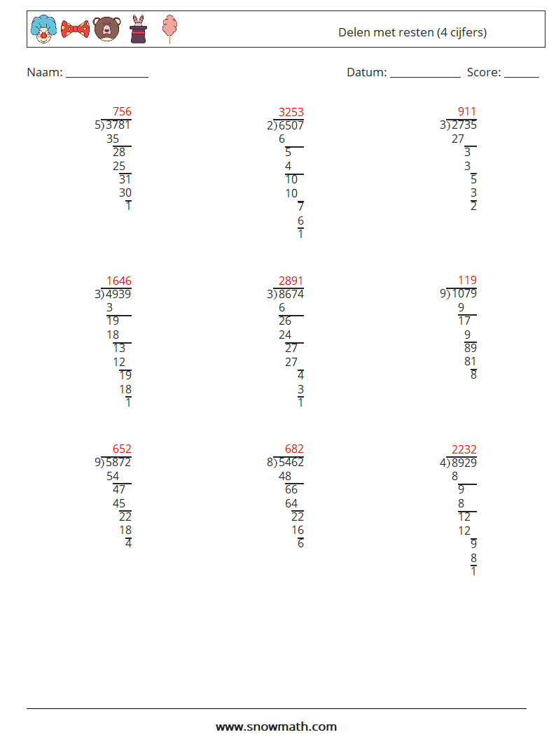 (9) Delen met resten (4 cijfers)