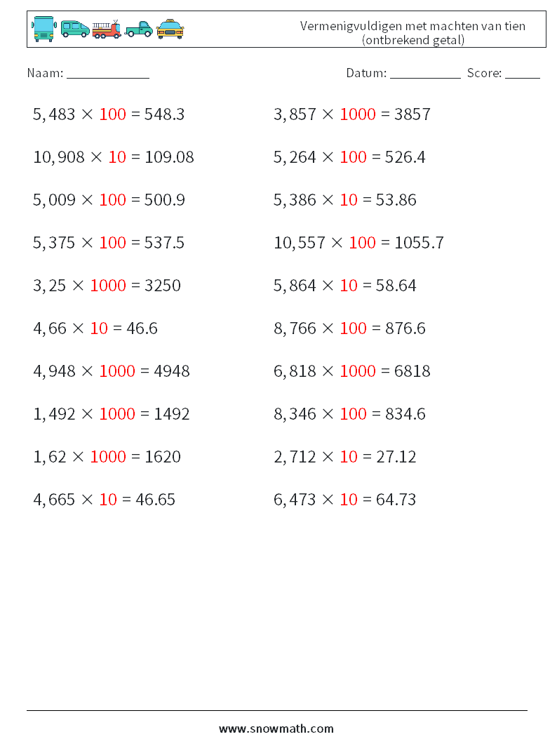 Vermenigvuldigen met machten van tien (ontbrekend getal)