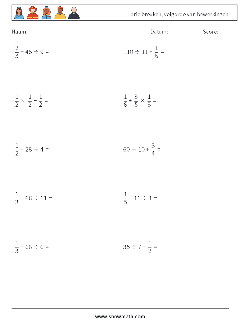(10) drie breuken, volgorde van bewerkingen Wiskundige werkbladen 12