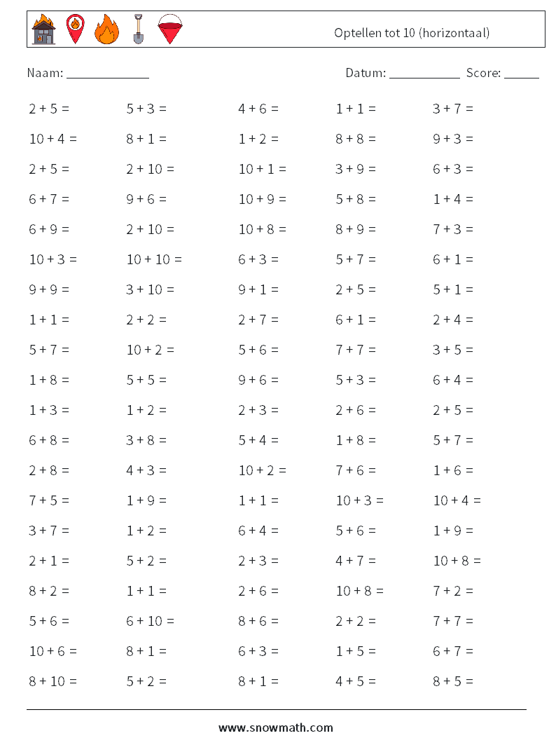 (100) Optellen tot 10 (horizontaal) Wiskundige werkbladen 5