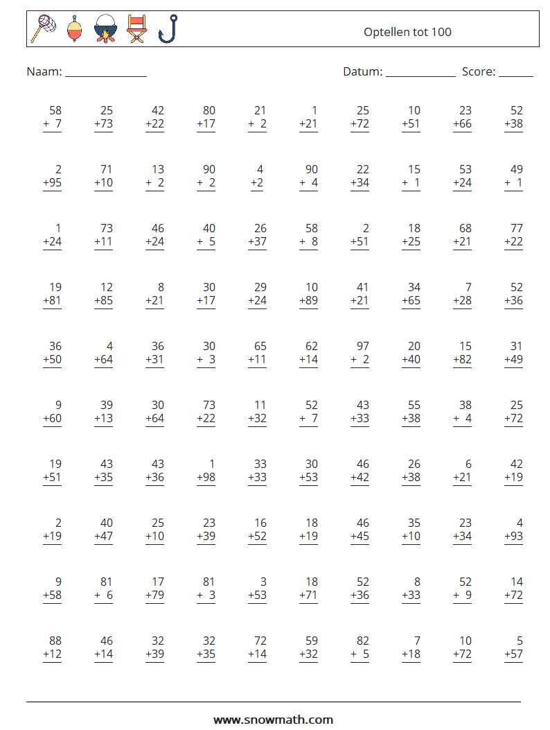 (100 wiskundevragen) Leer optellen tot 100, gratis wiskundewerkbladen.