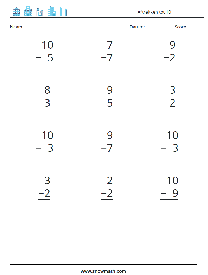 (12) Aftrekken tot 10 Wiskundige werkbladen 7