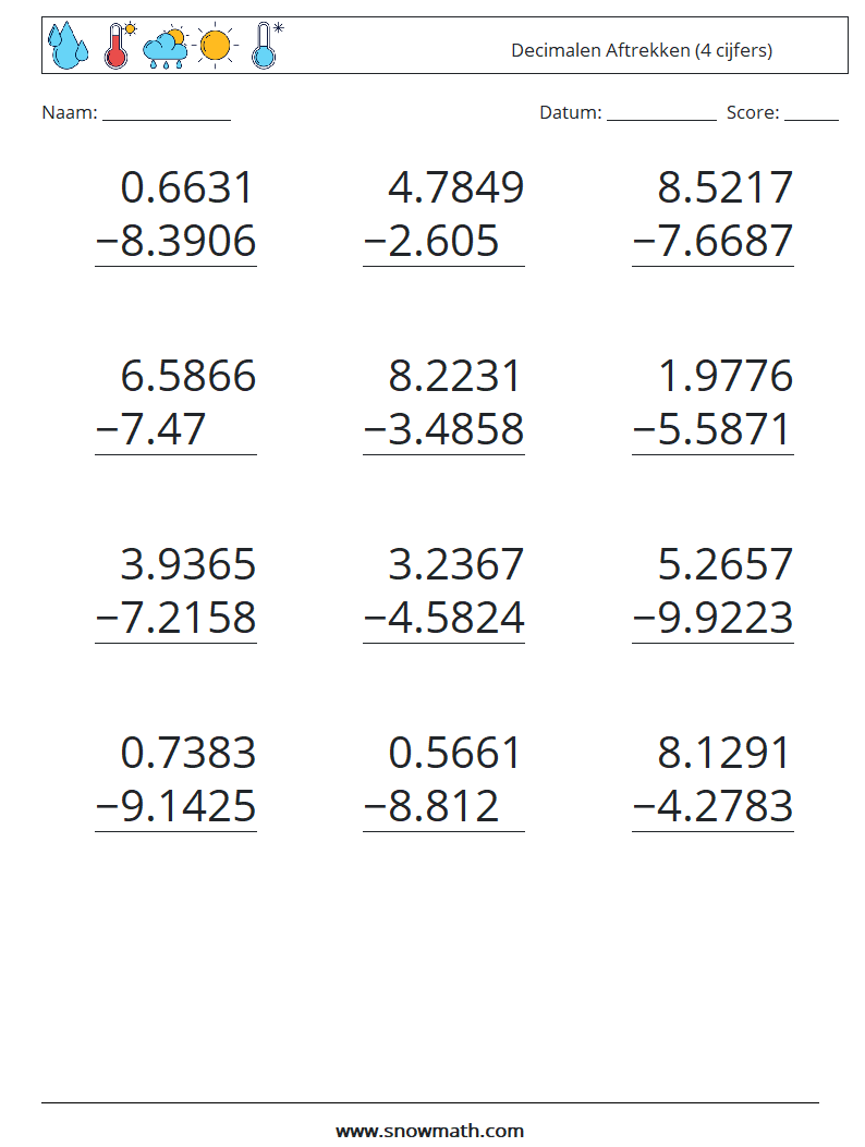 (12) Decimalen Aftrekken (4 cijfers) Wiskundige werkbladen 4