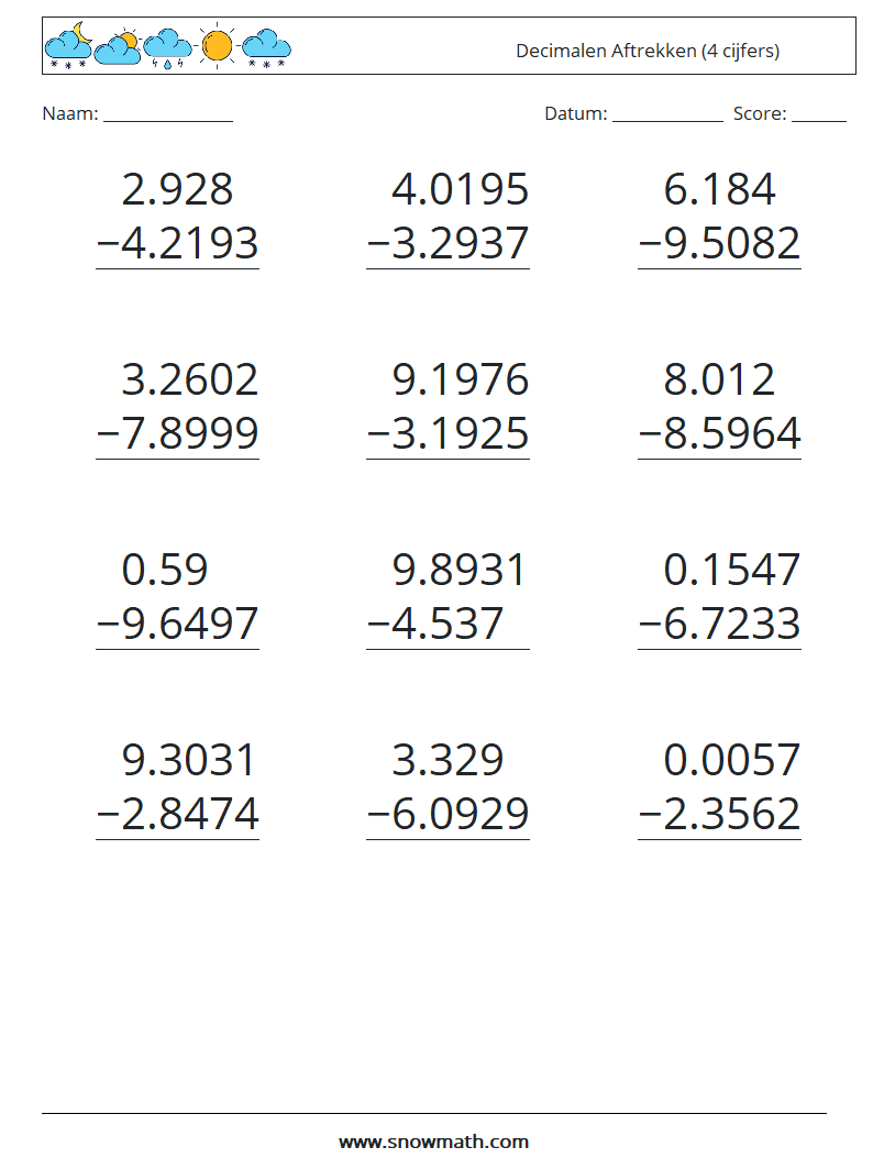 (12) Decimalen Aftrekken (4 cijfers) Wiskundige werkbladen 16